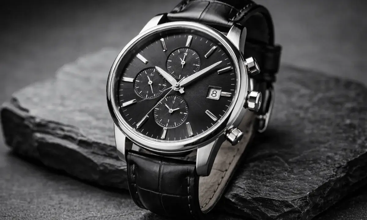 High end commercial product photography of a luxury wristwatch with a black leather strap and a silver case. The watch is placed on a piece of dark, textured slate. Clean, minimalist composition. Studio lighting with a softbox to create soft, even highlights and subtle shadows. Shot on a Fujifilm X-T4 with a macro lens, tack sharp focus on the watch face, shallow depth of field, 8K.