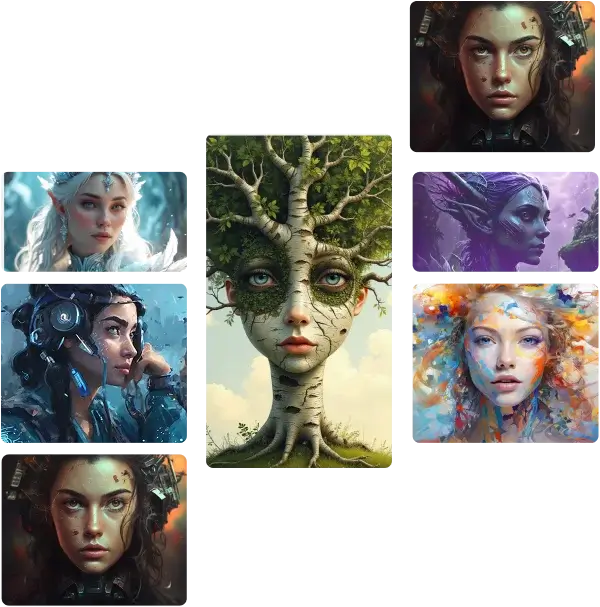 کلاژی از پرترههای متنوع و فوتورئالیستی از زنان با الهام از فانتزی و علمی-تخیلی. در مرکز، زنی با صورت ترکیب شده با درخت، دارای برگ و شاخه به جای مو، در پسزمینه طبیعت. اطراف آن، پرترههایی با سبکهای مختلف: زنی سایبرپانک با هدست در محیط شهری تاریک، زنی اثیری و یخی با موهای سفید در یک محیط فانتزی زمستانی، و زنی با موهای مواج و رنگارنگ به سبک آبرنگ. تاکید بر جزئیات بافت، نورپردازی دراماتیک و پالتهای رنگی متنوع که از سرد تا گرم متغیر هستند.